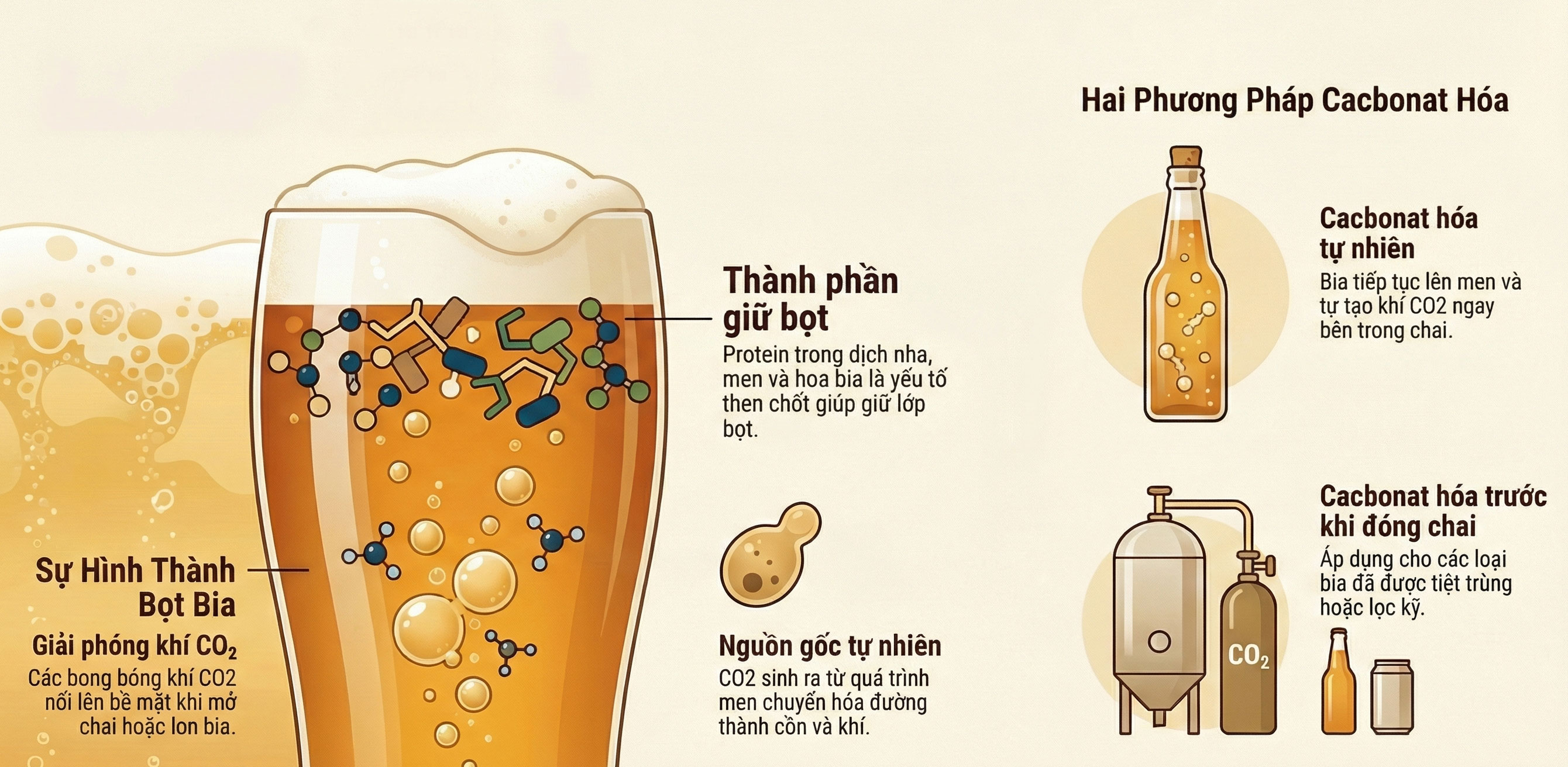 và khí CO₂. Lượng khí này hòa tan trong bia và sẽ thoát ra ngoài khi chai hoặc lon được mở, tạo nên các bong bóng và lớp bọt đặc trưng.