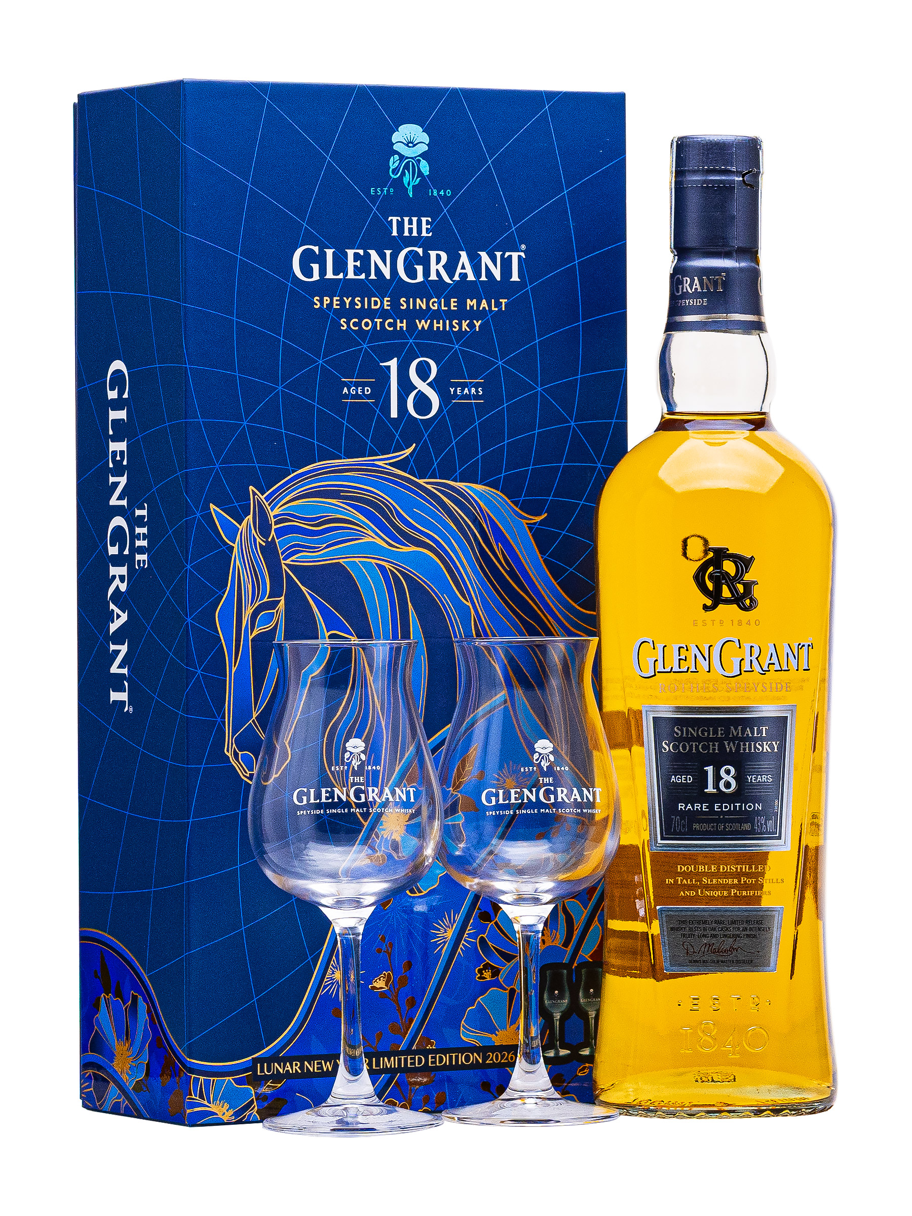 Rượu Glen Grant 18 năm - Set hộp quà Tết Bính Ngọ 2026 + 2ly. Đây là sản phẩm nằm trong core collection của thương hiệu, chai 18 năm tuổi này đậm đà và phức hợp với hương caramel, nho khô và vani. Đây là một loại whisky tuyệt vời dành cho những người yêu thích whisky Speyside hảo hạng với nhiều tầng hương vị ngọt ngào.