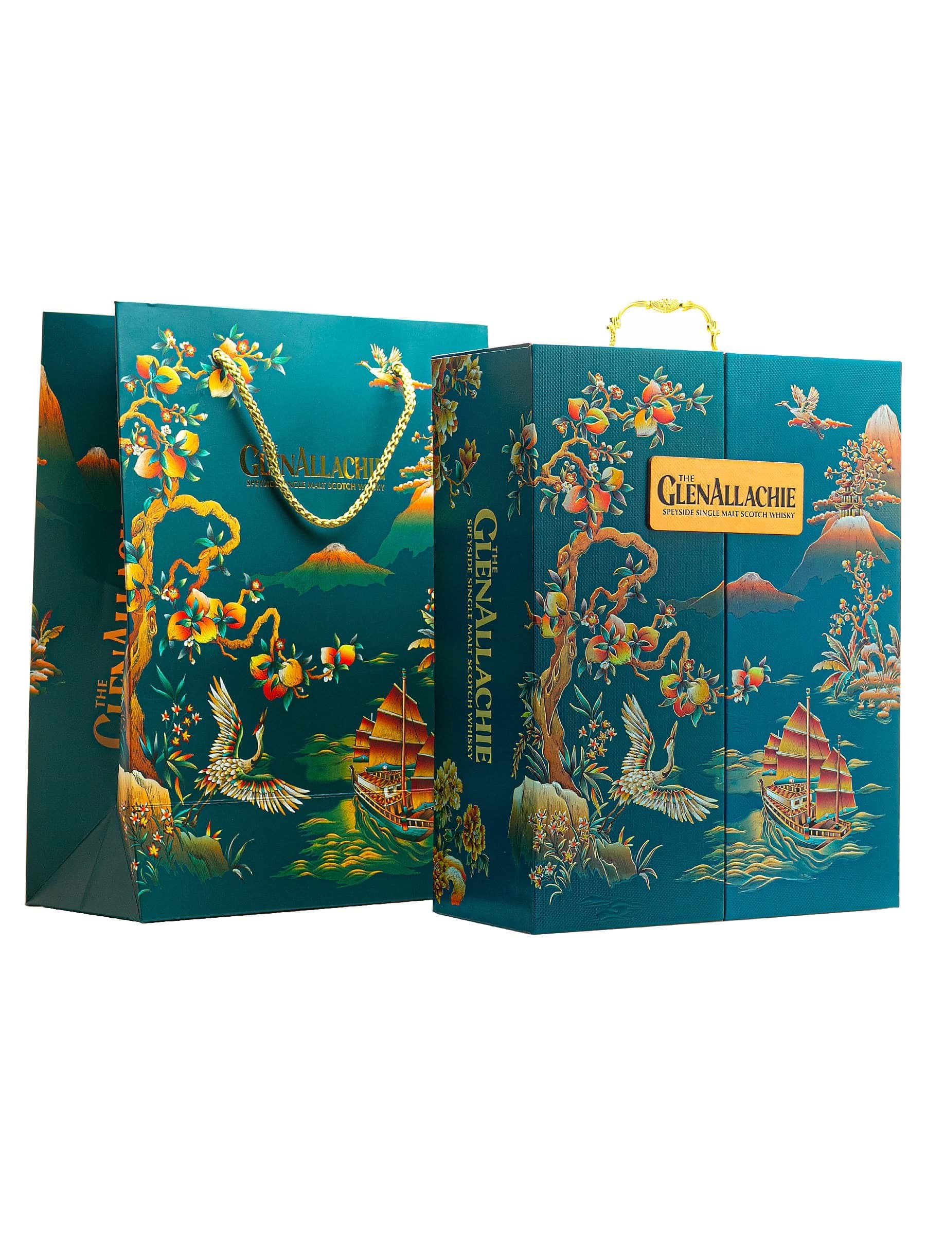 Rượu GlenAllachie 12 năm Hộp quà Tết Bính Ngọ 2026 gồm hộp màu đỏ sang trọng cùng 2 ly rock pha lê của Riedel và chai whisky single malt GlenAllachie 12 năm tuổi.