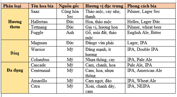 Dưới đây là bảng phân loại các loại hoa bia dựa trên hoa bia tạo vị đắng, hoa bia tạo hương thơm và hoa bia đa dụng