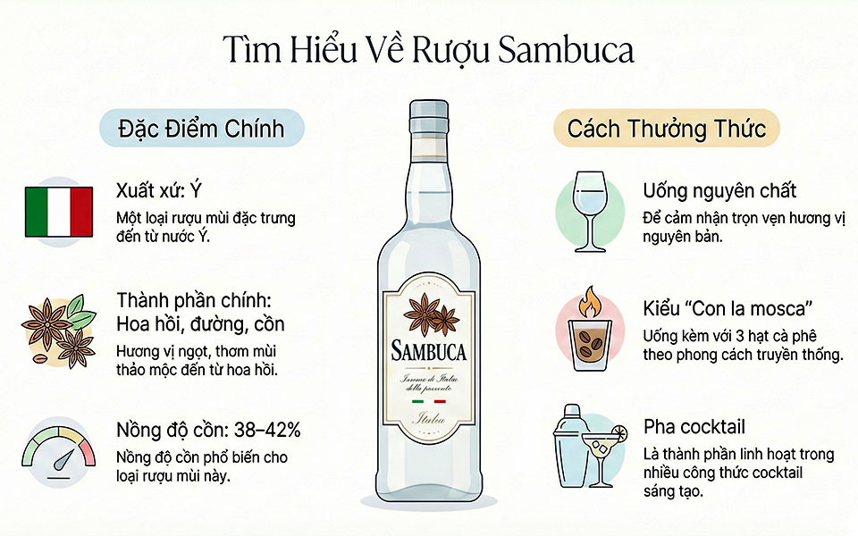 Sambuca là một loại rượu mùi hương hồi có nguồn gốc từ Ý. Được biết đến với hương vị mạnh mẽ và đặc tính thơm, loại rượu này chủ yếu được làm từ tinh dầu chiết xuất từ hoa hồi.