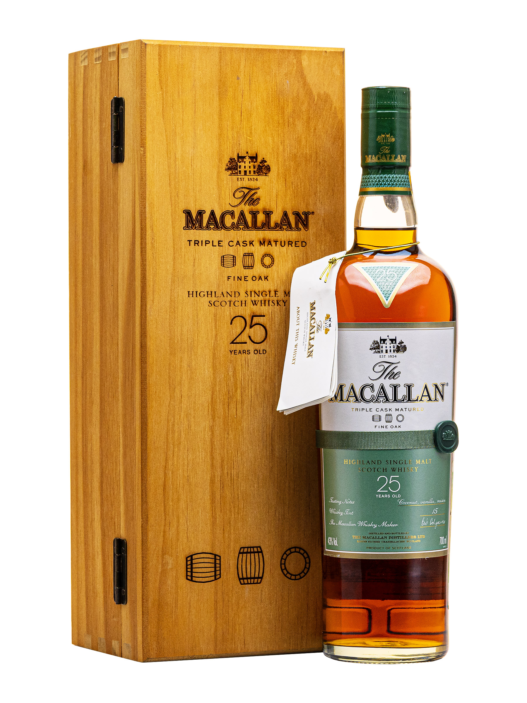 Rượu Macallan 25 năm Fine Oak hộp gỗ, với hương vị phong phú của trái cây, vani và mùi khói gỗ.
