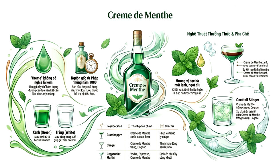 Creme de Menthe là rượu mùi bạc hà có nguồn gốc từ Pháp, hương vị mát lạnh, ngọt dịu, thường dùng làm rượu tiêu hóa hoặc pha chế cocktail.