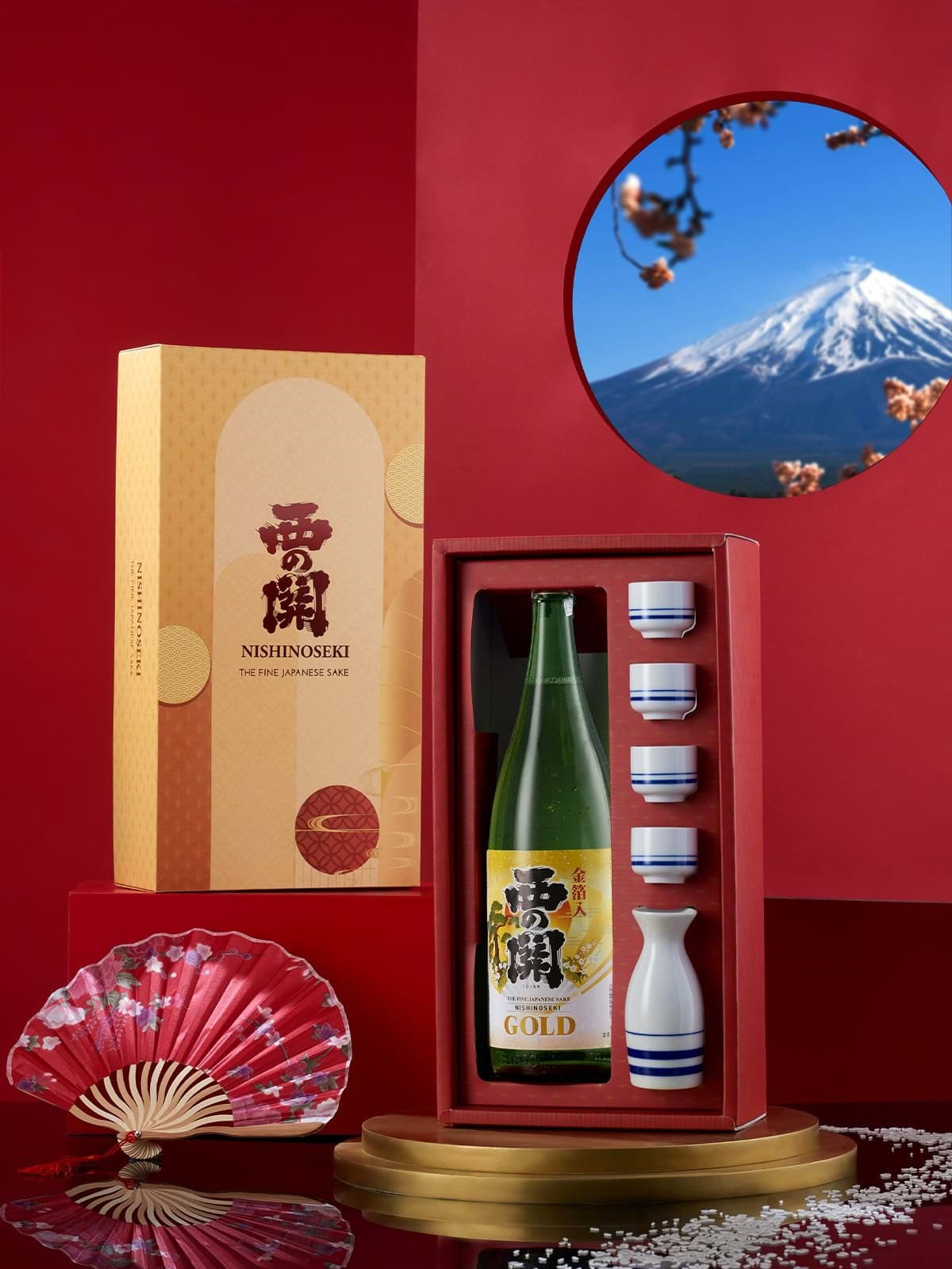 Hộp quà tết Sake Nishinoseki Gold Leaf - Lộc Vàng Khai Xuân + 1 bình sứ và 4 ly uống Sake.
