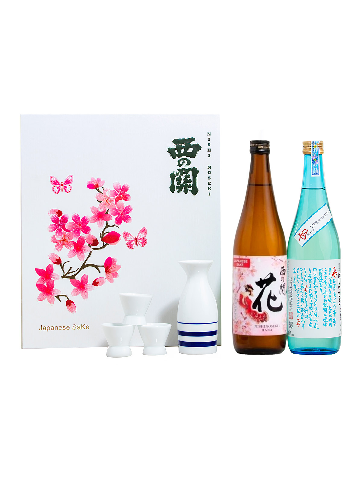 Sake Nishinoseki Hiya + Hana - Hộp quà đôi Hoa Anh Đào, kèm bình sứ và 2 ly. Hoa Anh Đào là sứ giả của mùa xuân Nhật Bản, là biểu tượng của sự trẻ hóa và tái sinh, khiến mọi người cảm thấy hân hoan và hạnh phúc cho mùa xuân sang. Thiết kế hộp với hình ảnh hoa Anh Đào nở rộ trên nền trắng - chúc bạn một năm mới sang với nhiều khởi đầu thuận buồm xuôi gió.