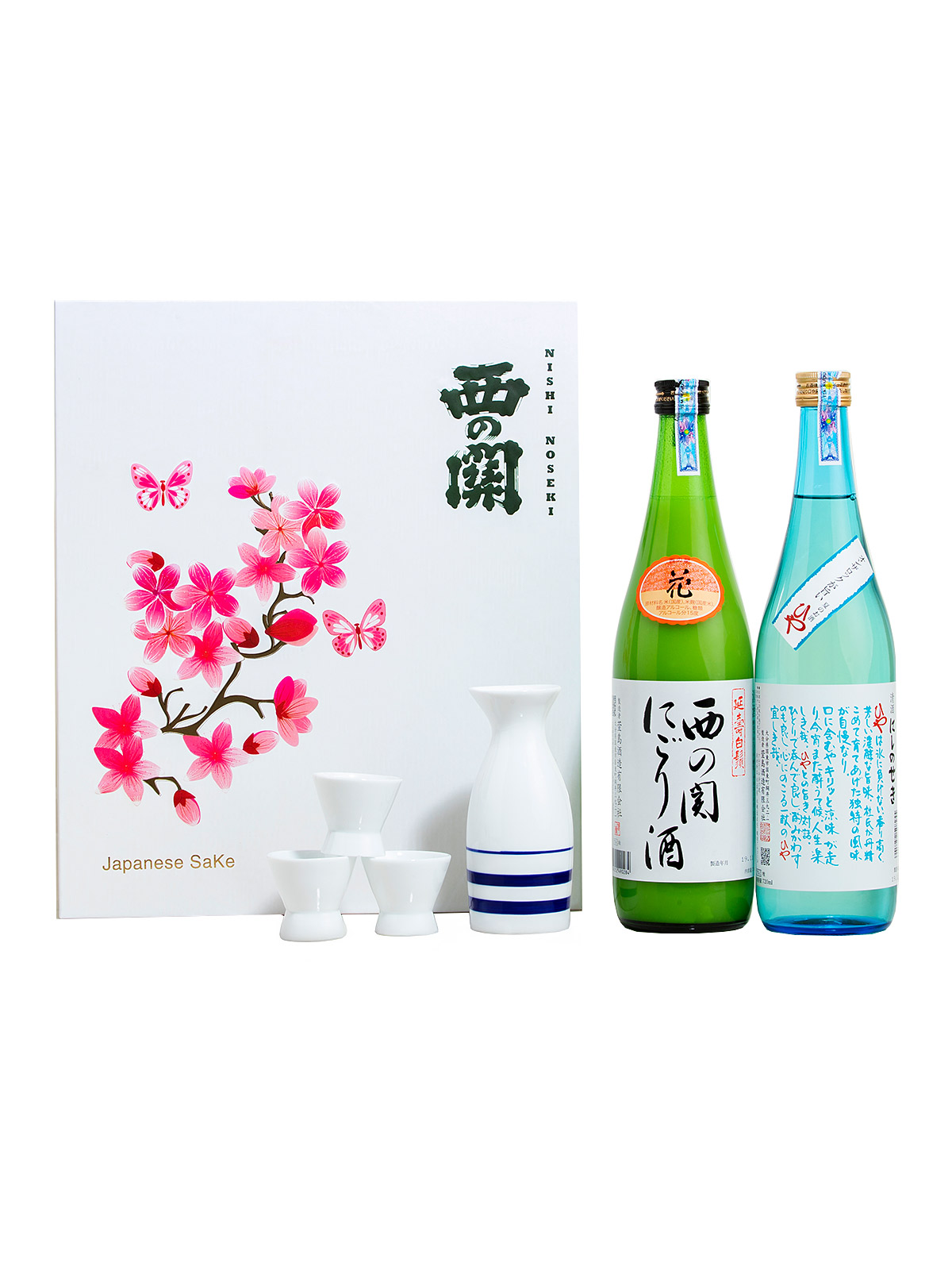 Hộp quà Hoa Anh Đào rượu Sake Nishinoseki Nigori và Sake Nishinoseki Hiya 720ml - bình sứ + 2 ly Tết Bính Ngọ 2026.