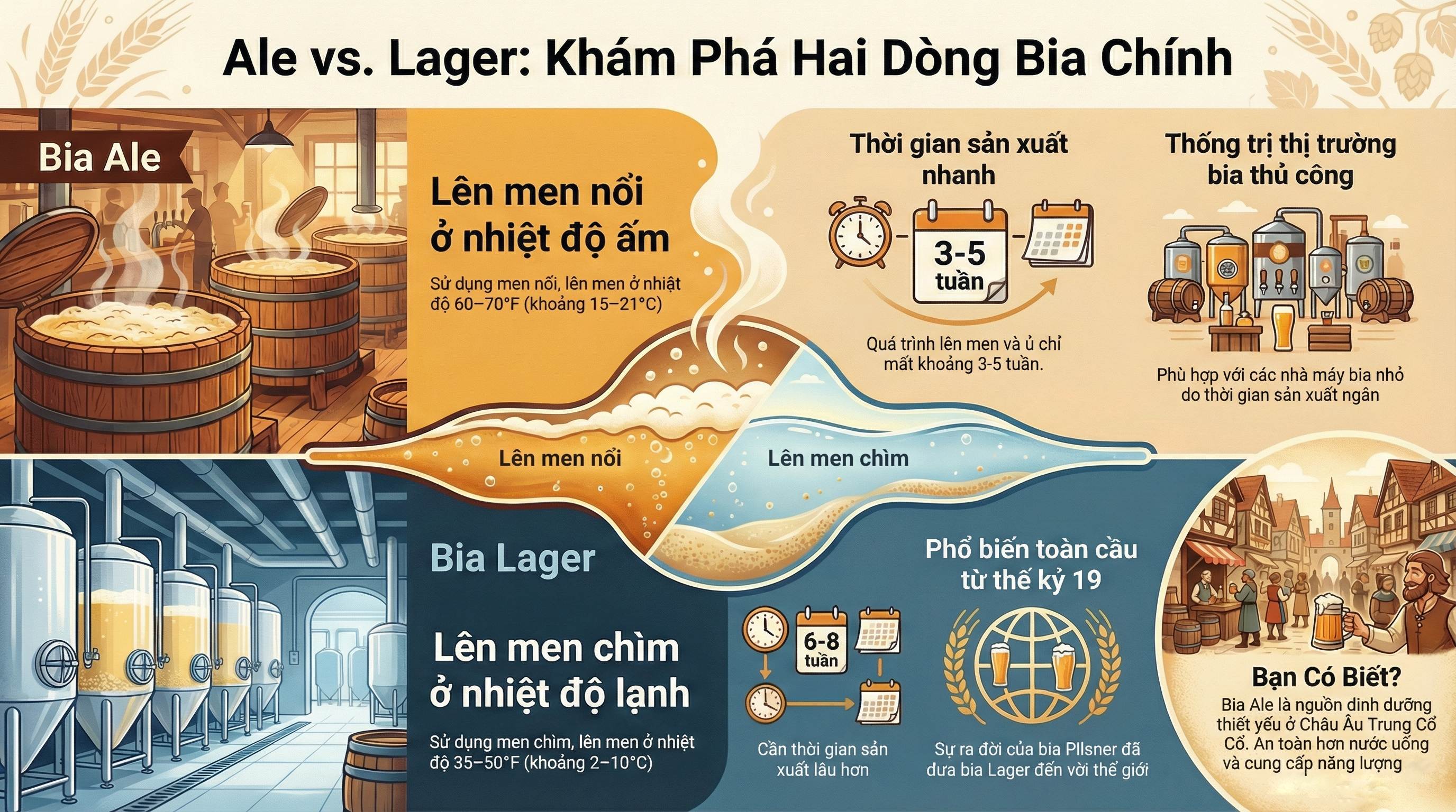 Bài viết dưới đây sẽ chia sẻ chi tiết về hai dòng bia chính: Bia Lager và Bia Ale nhé!