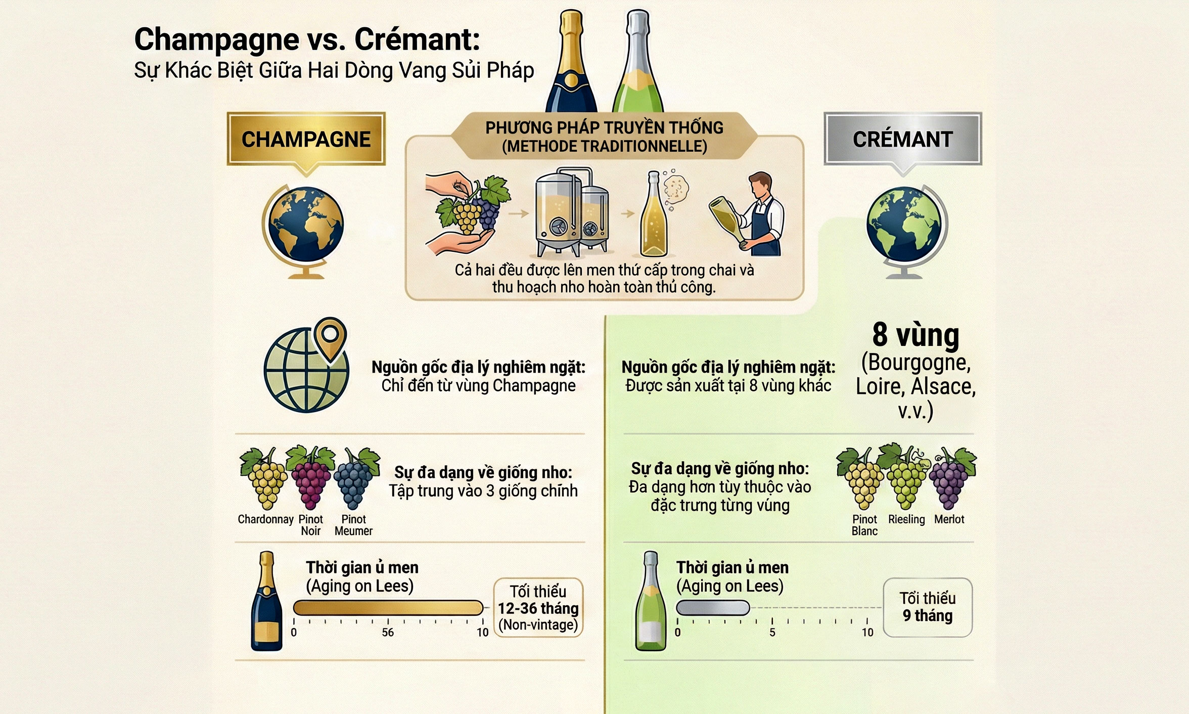 Champagne và Crémant đều là vang sủi bọt được sản xuất theo phương pháp truyền thống, nhưng khác nhau về xuất xứ, giống nho, thời gian ủ và giá thành. Champagne thuộc dòng vang sủi cao cấp và sang trọn, trong khi Crémant đa dạng phong cách, dễ tiếp cận với mức giá hợp lý. Việc lựa chọn phụ thuộc vào gu thưởng thức và túi tiền.