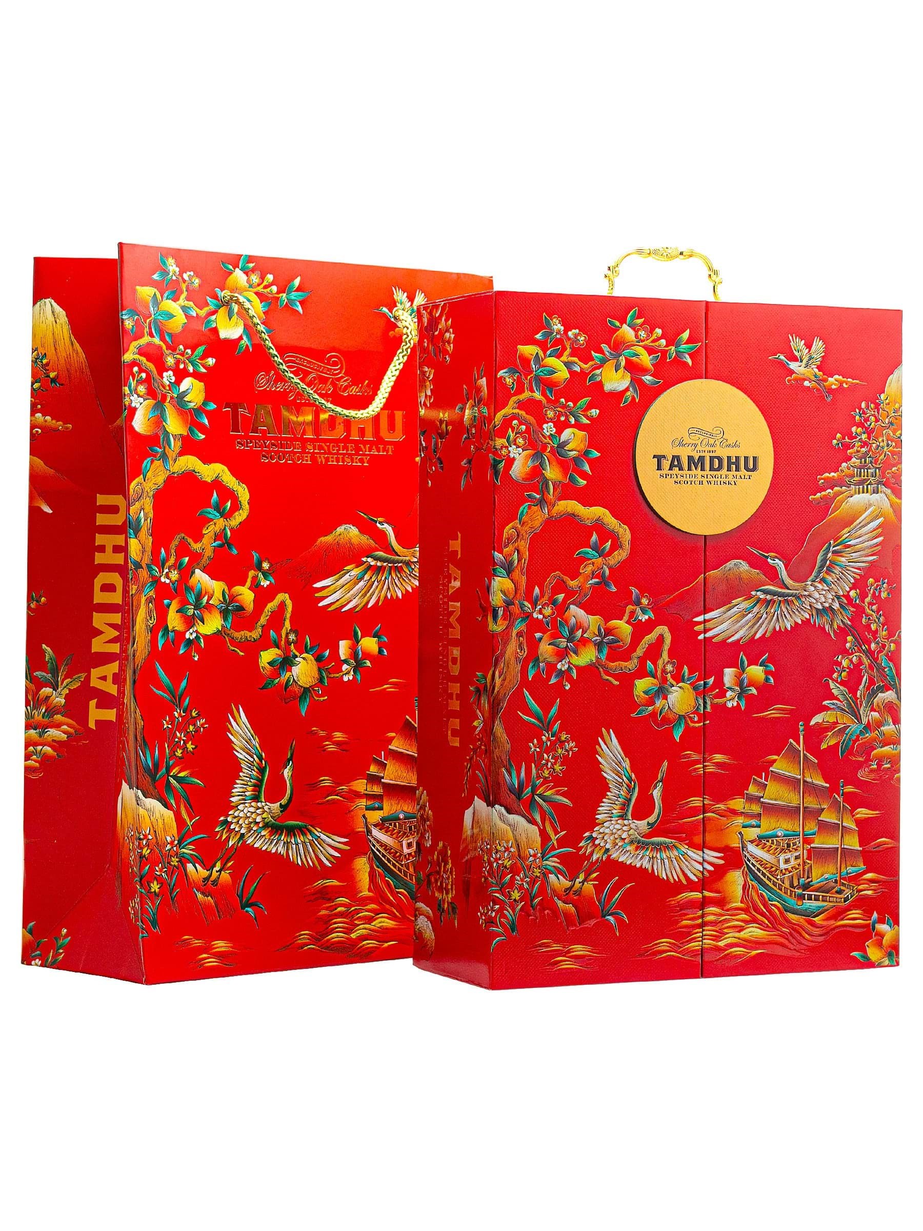 Rượu Tamdhu 12 năm Hộp quà Tết Bính Ngọ 2026 gồm hộp màu đỏ sang trọng cùng 2 ly rock pha lê của Riedel và chai whisky single malt Tamdhu 12 năm tuổi. Chai Tamdhu 12 đậm đà, thanh lịch này mang hương thơm của bánh quế cuộn, kẹo cam, gỗ sồi tươi, nho khô và thoang thoảng chút bạc hà. Vòm miệng mang đến hương chuối, mứt mâm xôi, bánh quy mạch nha và gỗ sồi nướng, trước khi chuyển sang hương quế xay, trái cây khô.