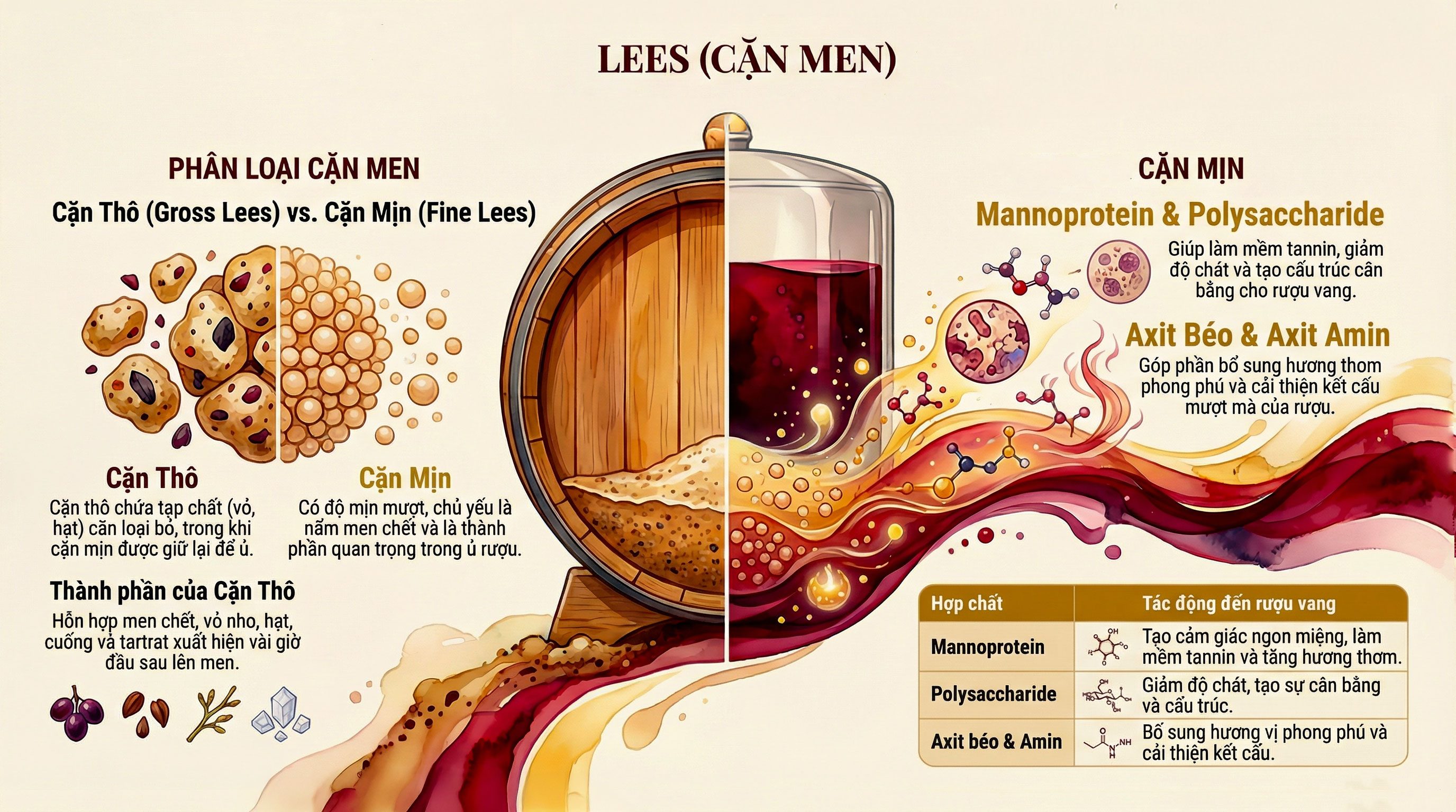 Lees (cặn men) là các tế bào nấm men chết còn sót lại sau quá trình lên men.