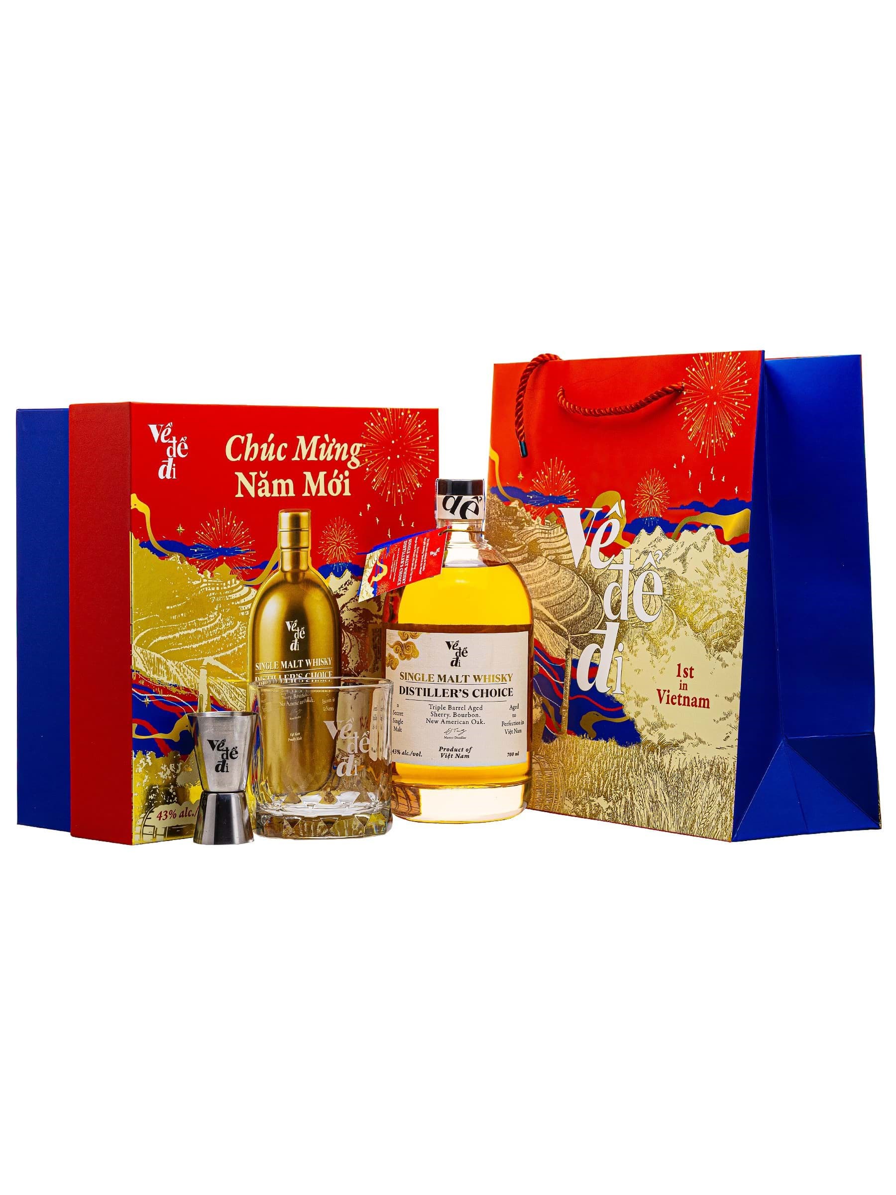 Rượu whisky single malt Về Để Đi Distiller's Choice - Set hộp quà Tết Bính Ngọ 2026. Ve De Di Distiller's Choice là whisky single malt Việt Nam đầu tiên được phát hành thương mại. Rượu chưng cất bởi một nhà máy dấu tên/Secret Distillery và ủ trong thùng Bourbon, sau đó rượu được ủ hoàn thiện trong thùng Sherry và thùng mơi American Oak (Virgin oak barrel) tại Hà Nội, Việt Nam.